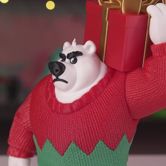 Este urso polar pode estar bravo, mas ele não esquece dos presentes! Esta peça decorativa combina atitude e espírito natalino em uma cena única: um urso polar imponente, vestindo um suéter festivo e carregando uma caixa de presente com determinação. Perfeito para adicionar personalidade e humor à sua decoração de mesa natalina.