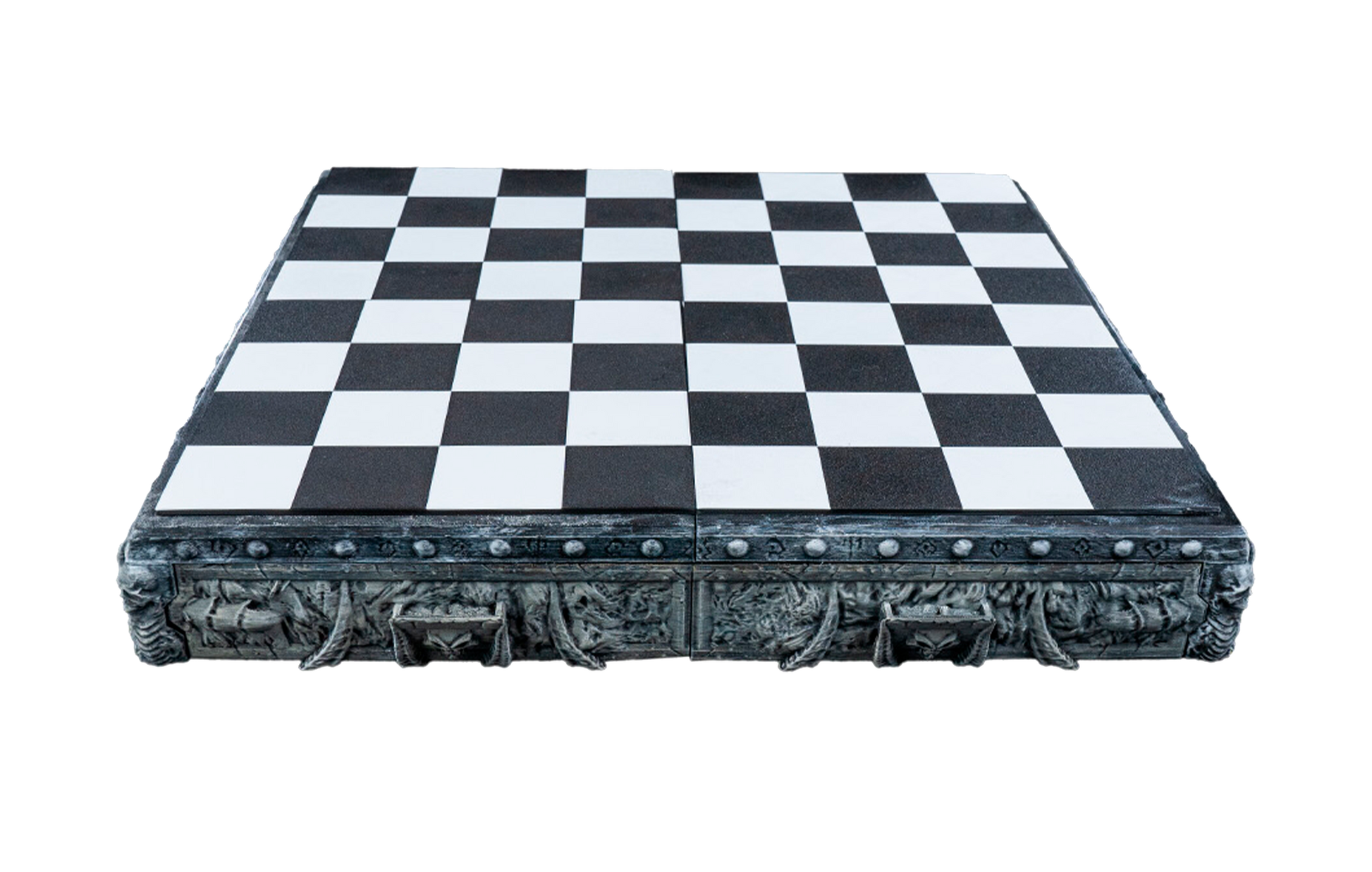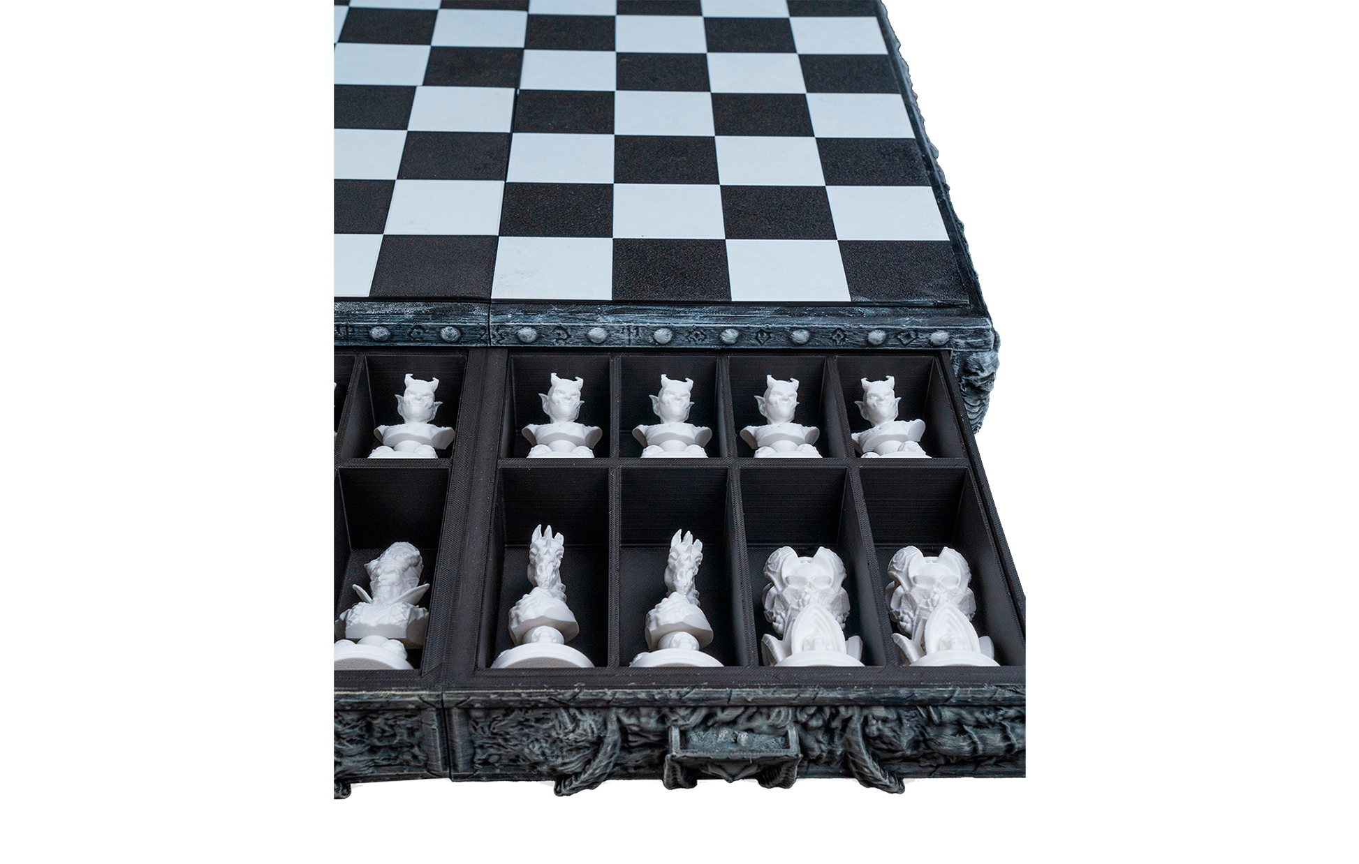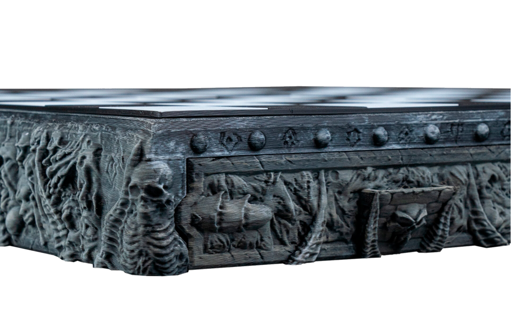 ✔ Detalhes macabros - Esqueletos entalhados nas laterais do tabuleiro