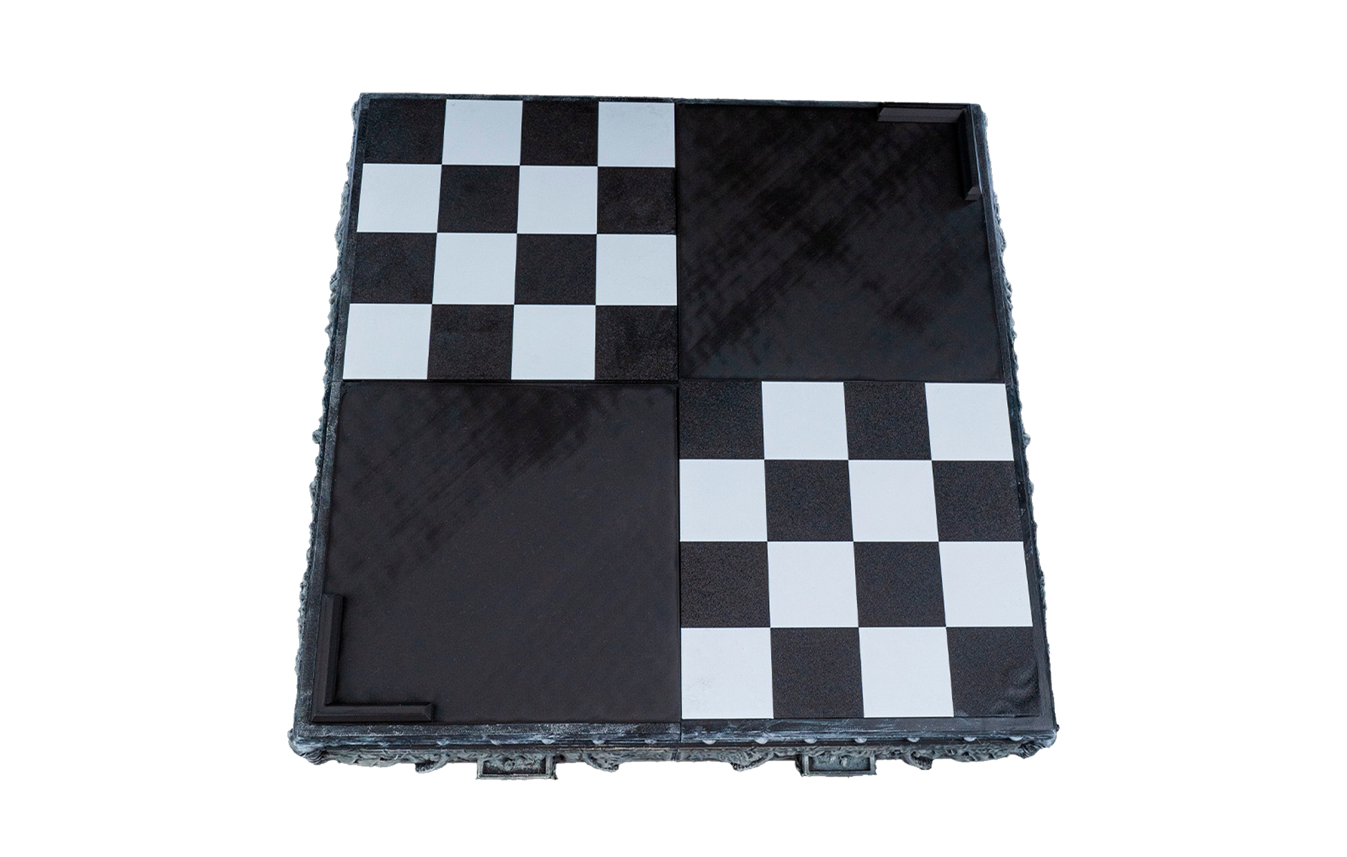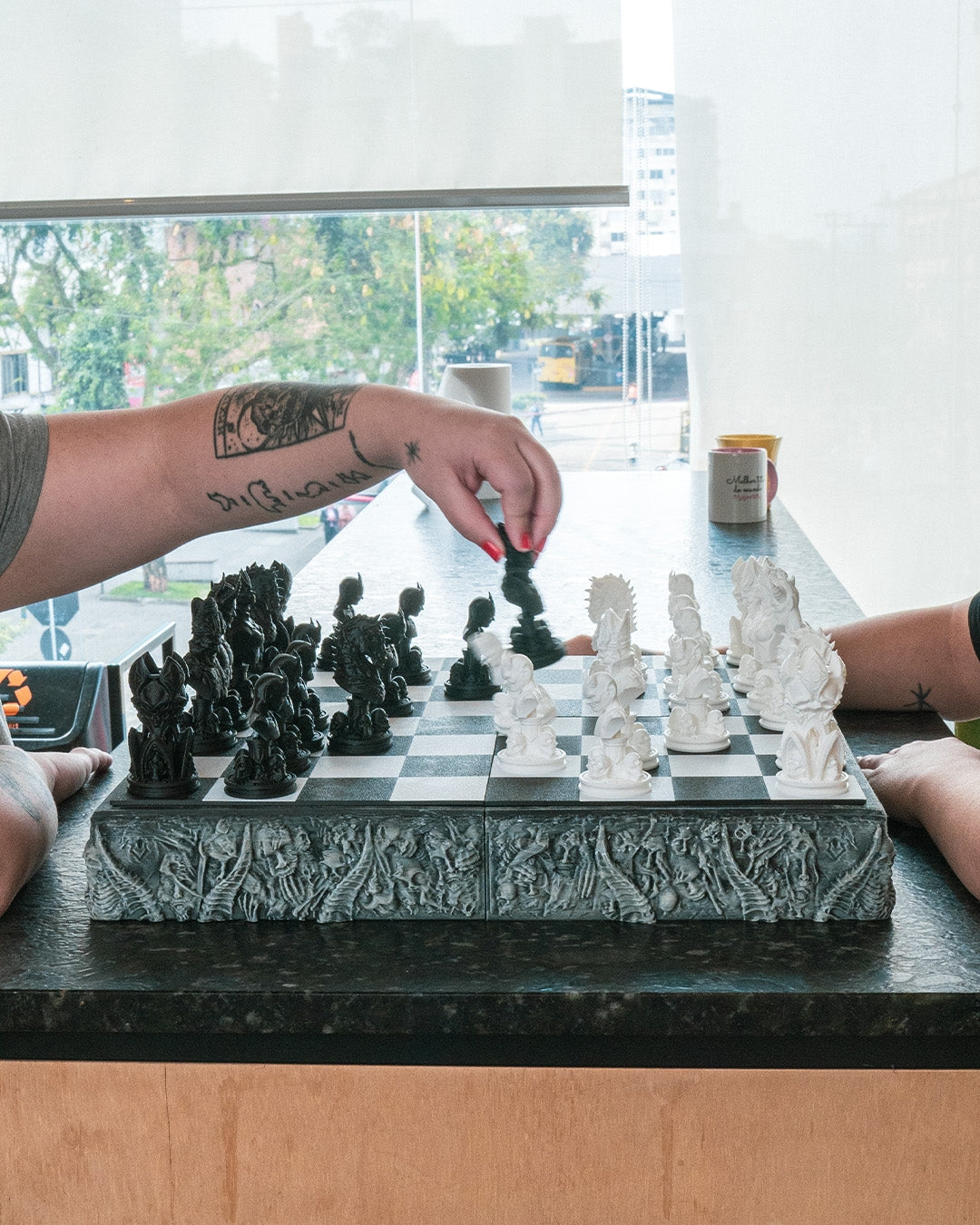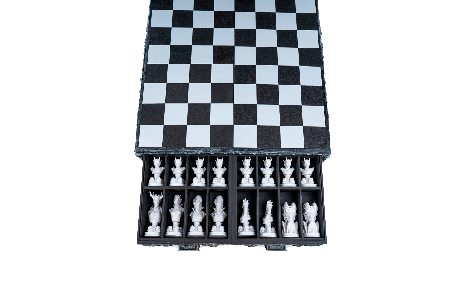 ✔ Detalhes macabros - Esqueletos entalhados nas laterais do tabuleiro