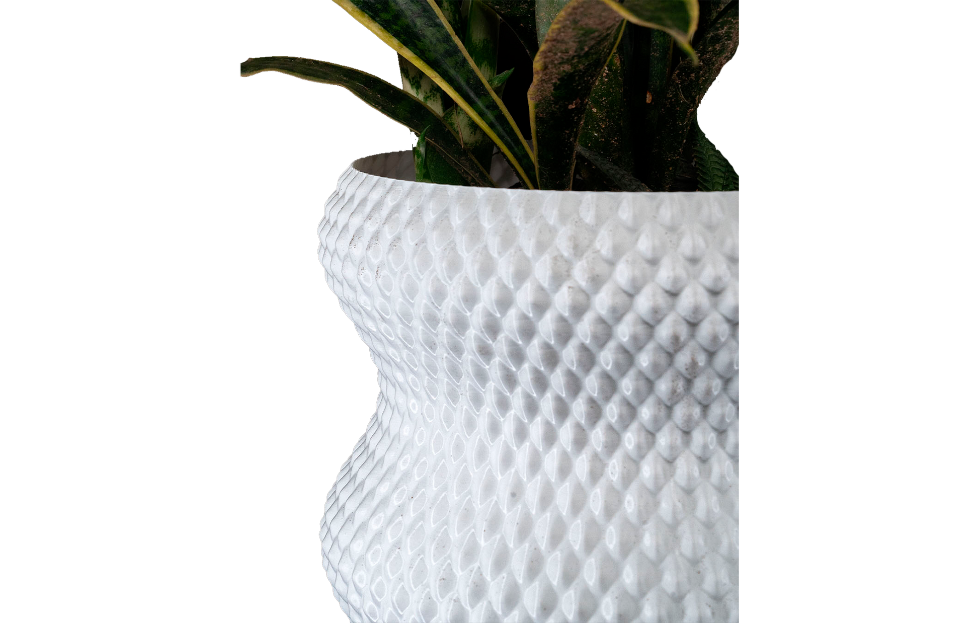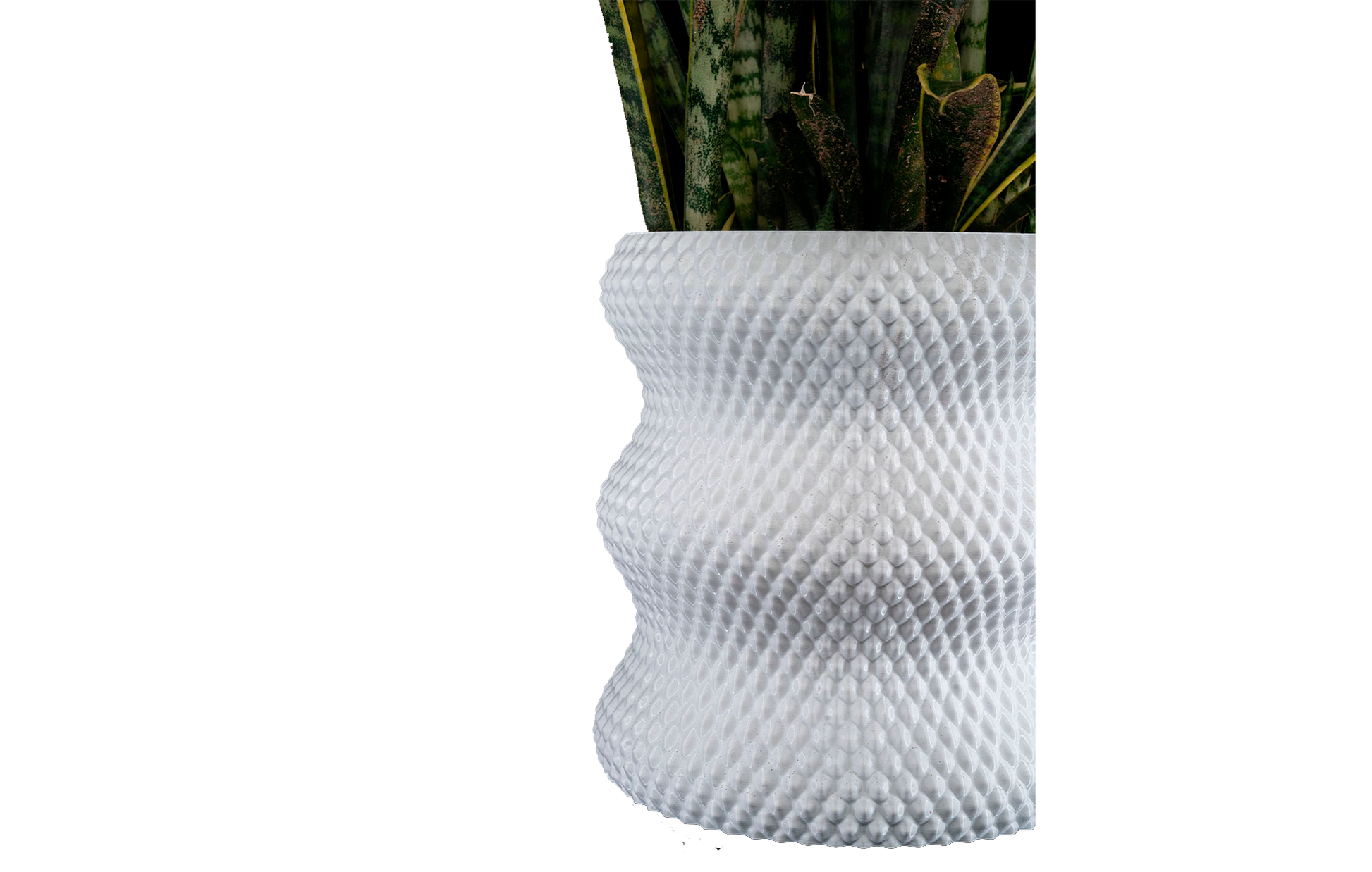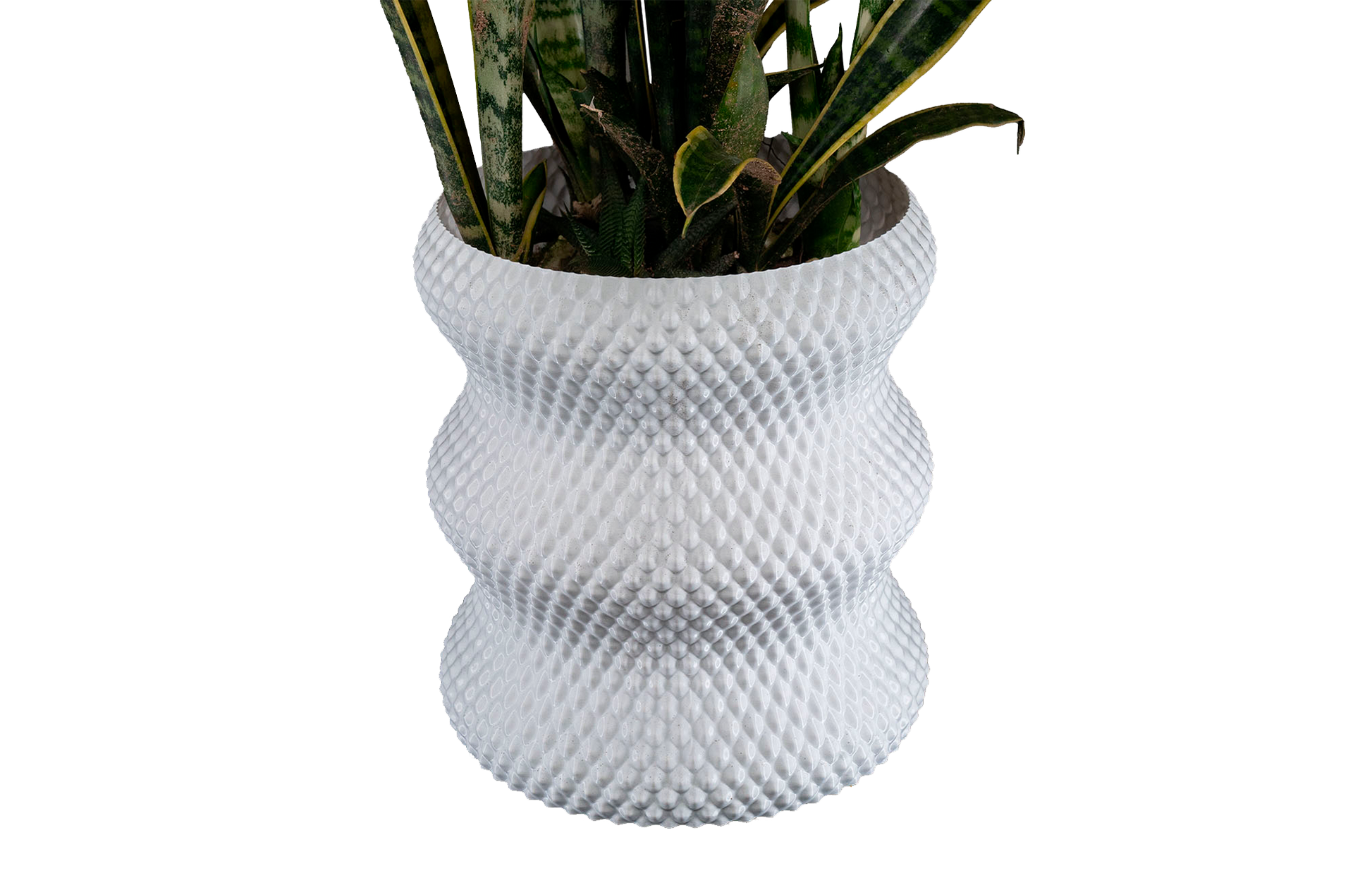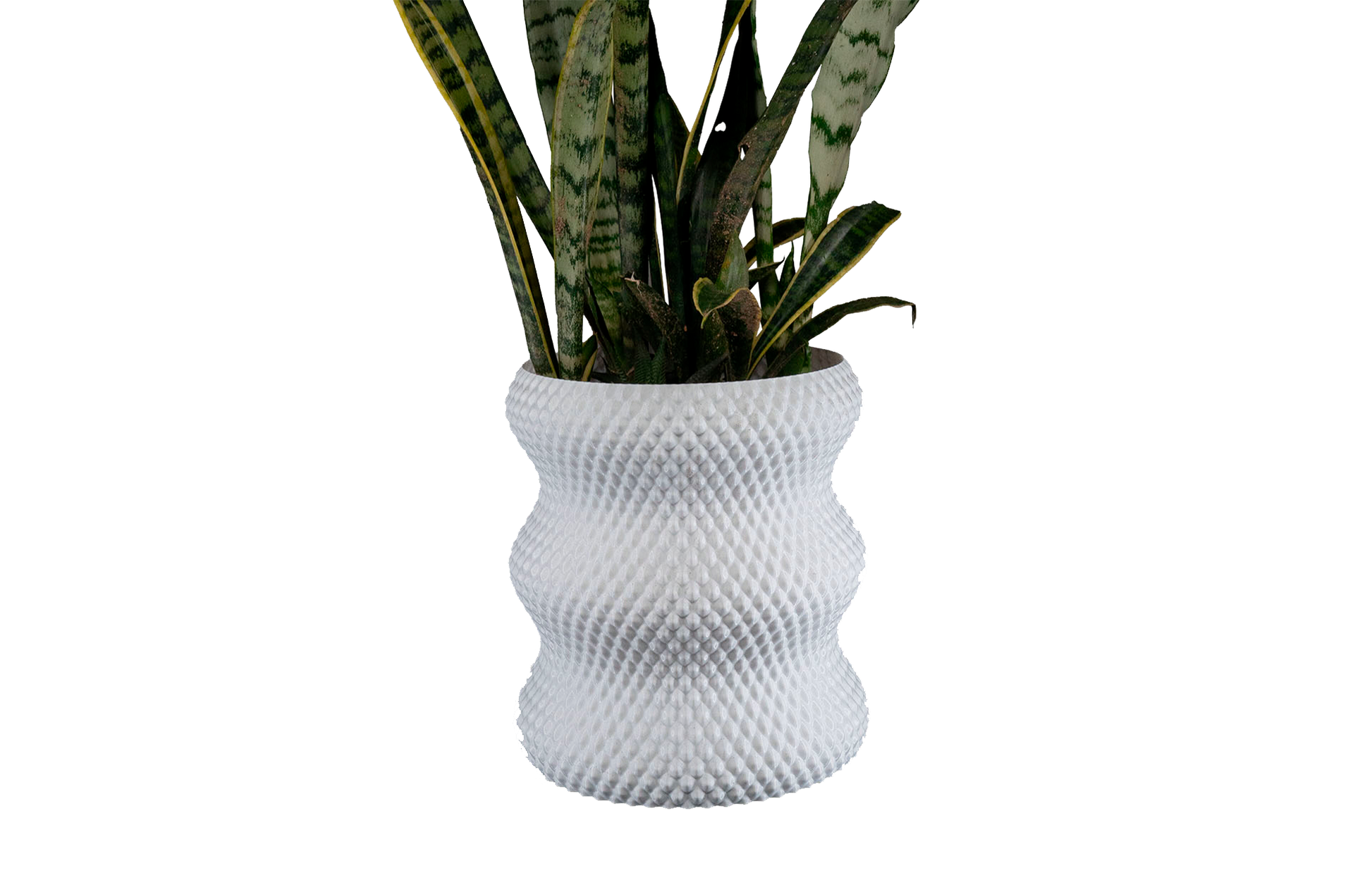 Transforme sua planta em uma joia da natureza com o DiamondWave! Este vaso combina um formato cilíndrico senoidal único (com 3 picos e 2 vales) e uma superfície texturizada que imita diamantes lapidados, criando um efeito de luz e sombra deslumbrante. Perfeito para quem busca um vaso que seja tanto um lar para plantas quanto uma escultura de design.